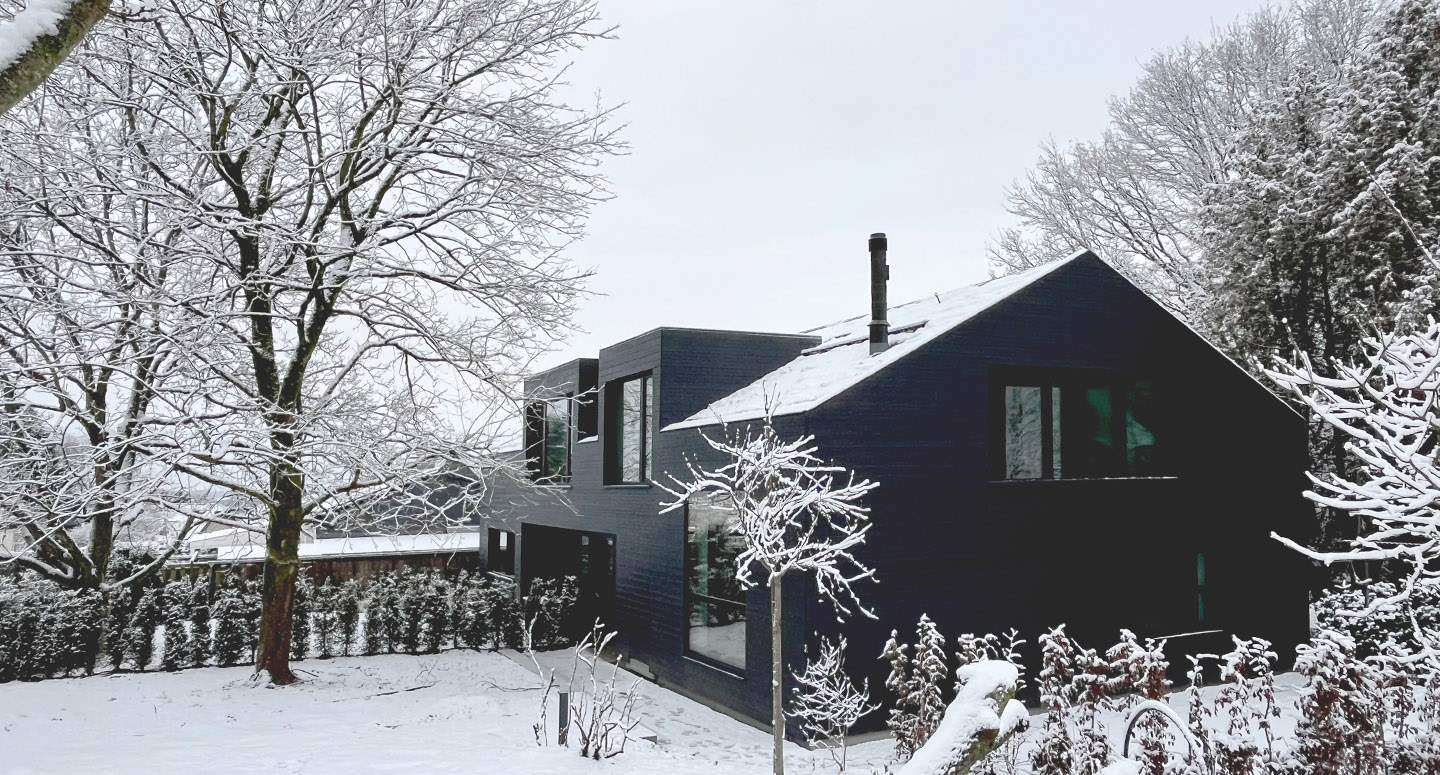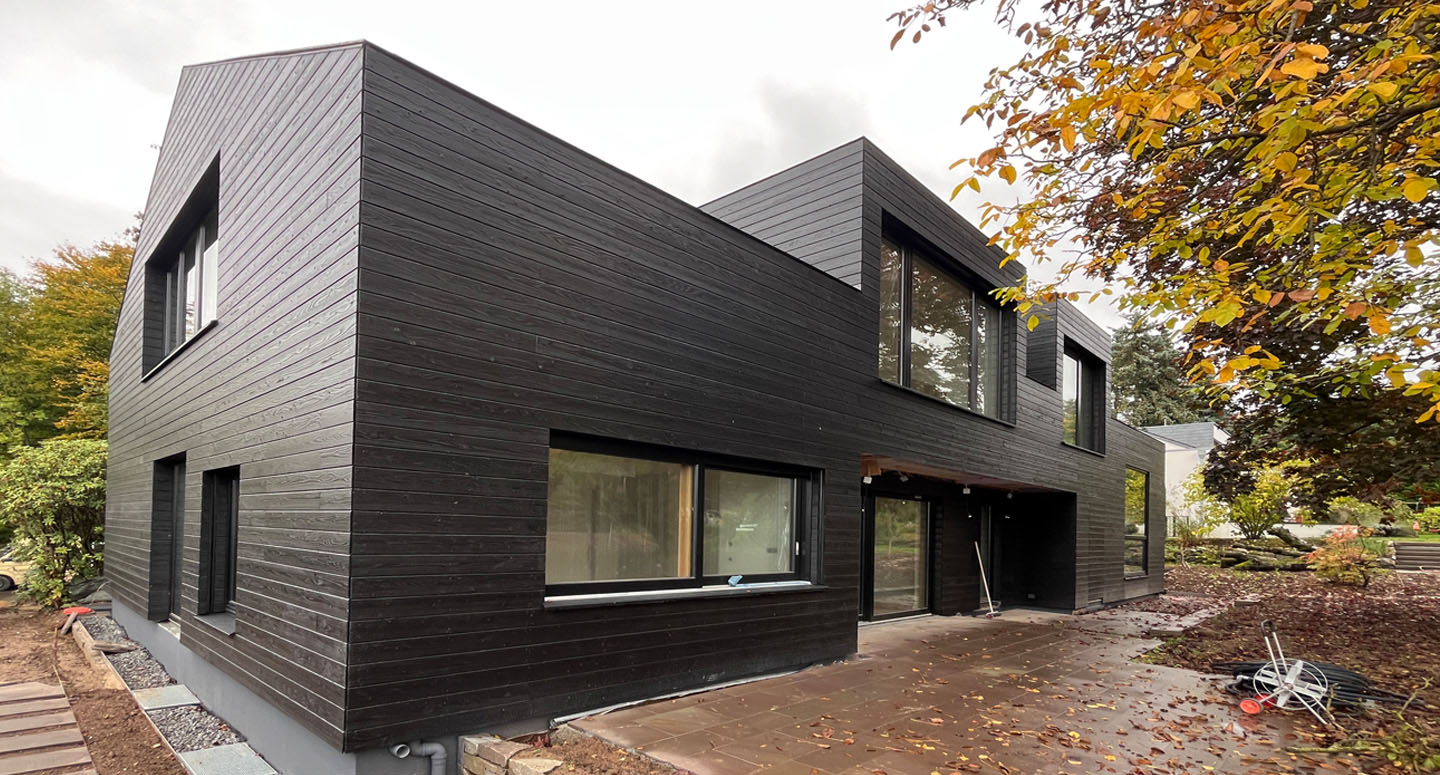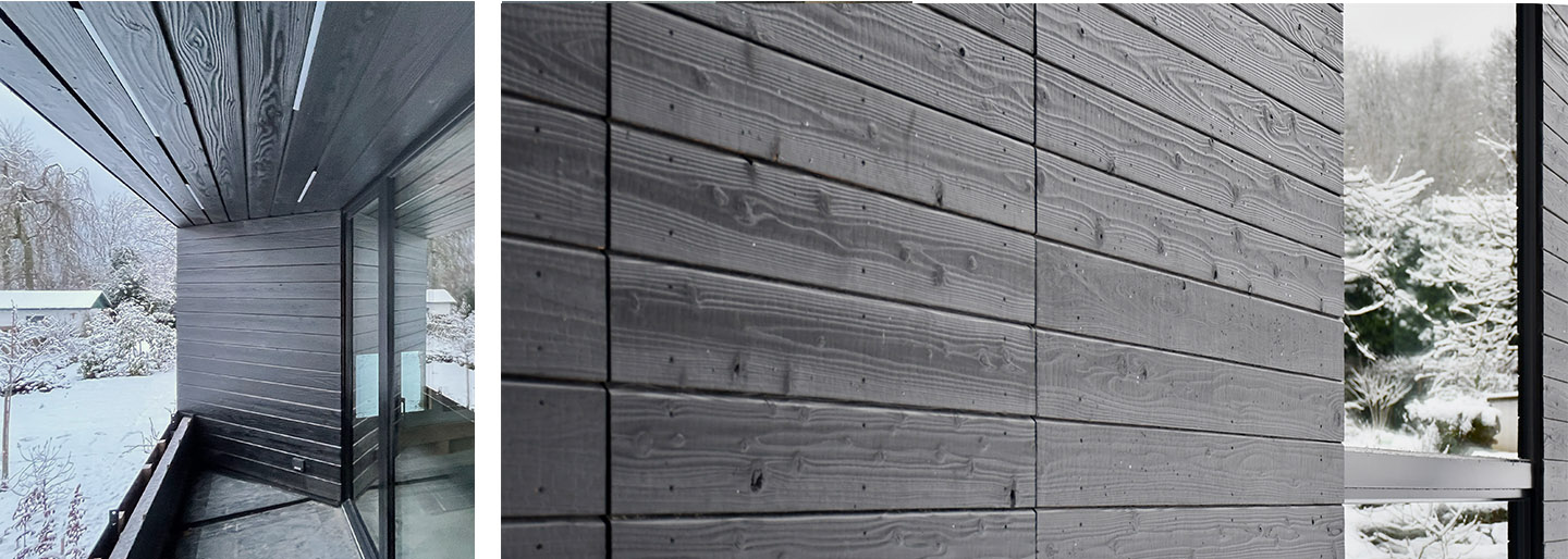 Im Außenbild wird das Gebäude mit karbonisiertem Holz verschalt, ein in japanischer Tradition witterungsfest behandeltes Holz. Für die gewünschte dunkle Holzschatulle – im Wald.