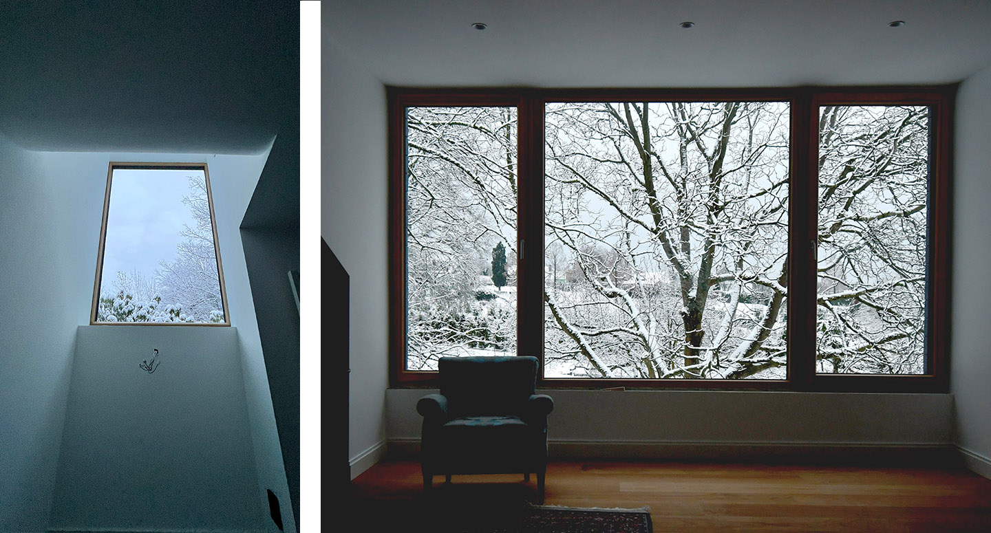 Den Dialog mit dem umgebenden Gartenbewuchs fanden wir über inszenierende Fenster, welche im Durchleben des Hauses besondere Ausblicke rahmen konnten. Und nach einem Aufstieg über die Treppe ins Obergeschoß, zu den großen Fenstern am Garten, weitet sich der Blick auf Höhe der Baumkronen.Fast der gesamte Neubau ist Holzbau, dabei können die Holzbalken des rückgebauten Dachstuhles in der Fassadenkonstruktion direkt wiederverwendet werden. Im Innern modulieren helle Wände und ein hölzerner Bodenbelag lichte und offene Räume. Die Ateliergarage bietet mit Kamin und Bar einen Raum für lange Abende.